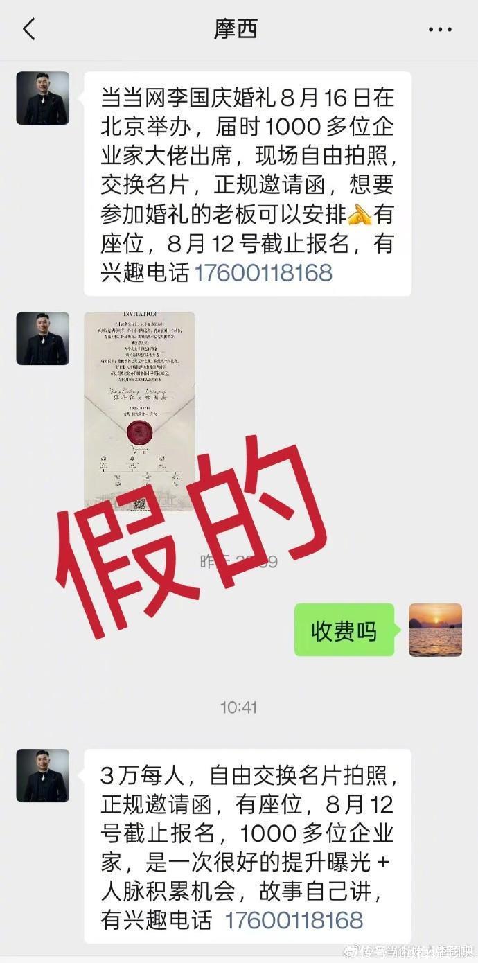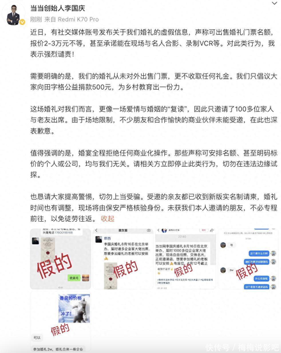 近日,有社交媒体账号发布关于我们婚礼的虚假信息,声称可出售婚礼门票名额,报价2-3万元不等,甚至承诺能在现场与名人合影、录制VCR等。对此类行为,我表示强烈谴责!