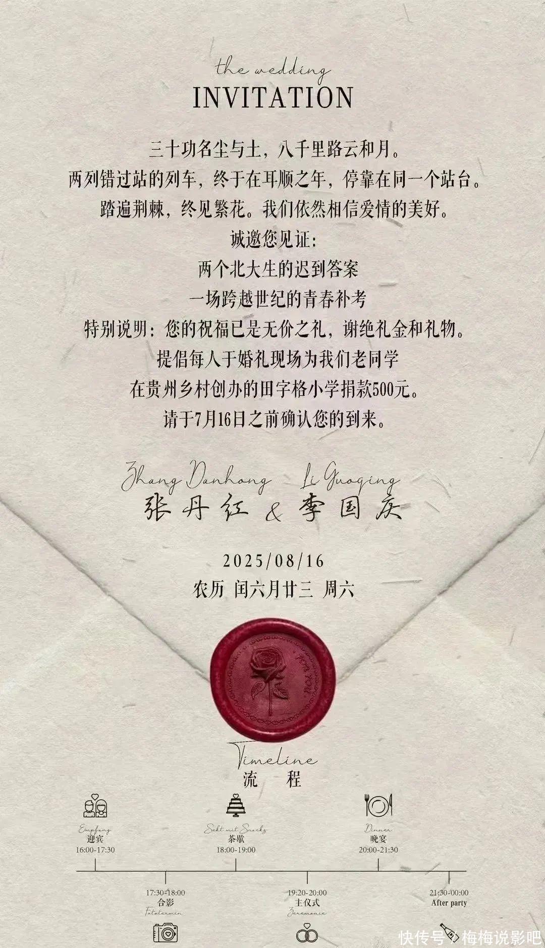 今年6月,有网友晒出当当创始人李国庆的结婚请柬,请柬显示婚礼将于2025年8月16日北京举办,女方是其北大校友。请柬显示,“谢绝礼金和礼物,提倡每人于婚礼现场为我们老同学在贵州乡村创办的田字格小学捐款500元”。