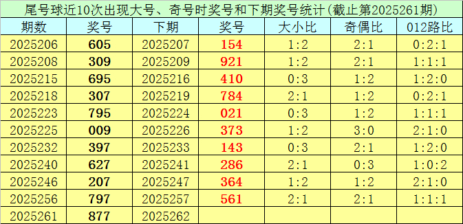 在尾号球前10次开出大号、奇号类型之后,其下期分别开出奖号:154、921、410、784、021、373、143、286、364、561,其中号码奇偶比为5:5,大小比为1:9,012路比为4:6:0。