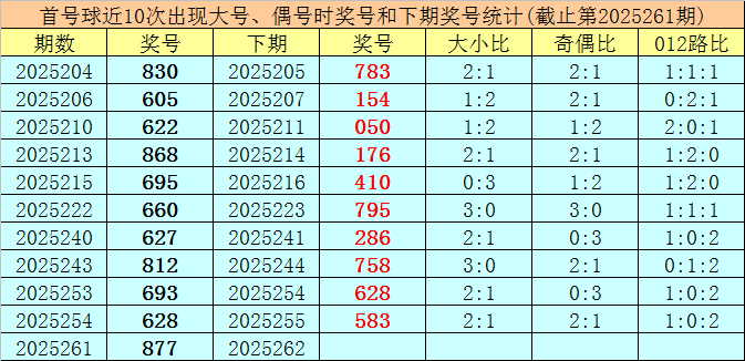 在首号球前10次开出大号、偶号类型之后,其下期分别开出奖号:783、154、050、176、410、795、286、758、628、583,其中号码大小比为5:5,012路比为2:6:2,奇偶比为6:4。