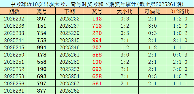 在中号球前10次开出大号、奇号类型之后,其下期分别开出奖号:143、713、220、994、207、558、190、693、628、561,其中号码奇偶比为5:5,大小比为5:5,012路比为5:2:3。