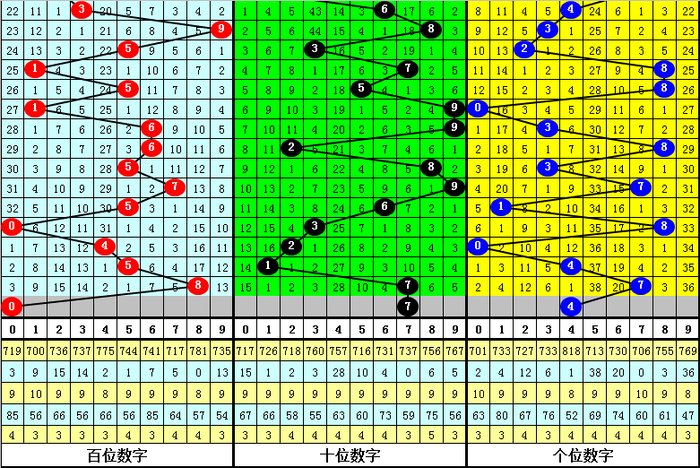 中号球:上期奖号为7,开出大号、奇号,该位前10次开出大号、奇号的现象时其奖号分别为:397、151、754、758、994、178、558、190、693、797,其中中号球012路比为5:1:4。