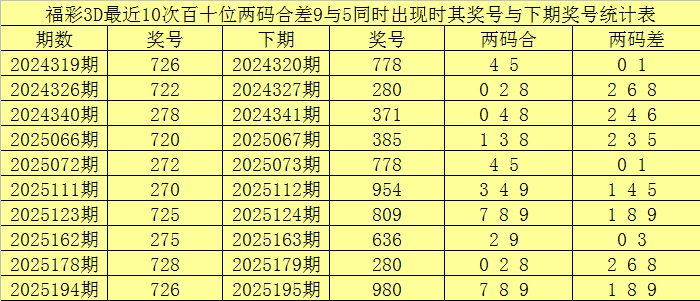 百十位合差分析:上期奖号百十位开出72组合,两码合为9,两码差为5,最近10次百十位两码合9与两码差5同时出现时,其奖号和下期奖号分别为: