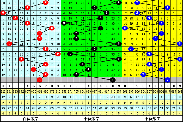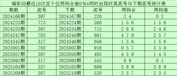 百个位合差分析:上期奖号百个位开出73组合,两码合为0,两码差为4,最近10次百个位两码合0与两码差4同时出现时,其奖号和下期奖号分别为: