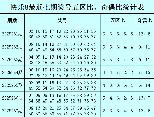 福彩快乐8第2025267期开奖回顾:08 13 20 21 25 34 37 39 45 47 50 57 58 60 65 71 72 75 78 79,其中奖号五区比为2:3:5:4:6,奇偶比为12:8,012路比为8:6:6。