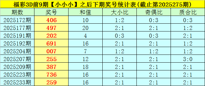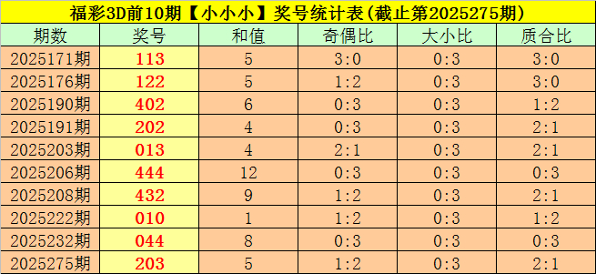 一、上期回顾:福彩3D第2025275期奖号为:203,奖号类型开出组六,大小比为0:3,奇偶比为1:2,和值为5,跨度为3,012路比为2:0:1。