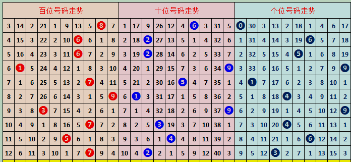 近10期012路比总比例为14 : 9 : 7,0路号码出号较热,上期开出012路比为1 : 1 : 1;本期预测012路比1 : 0:2。